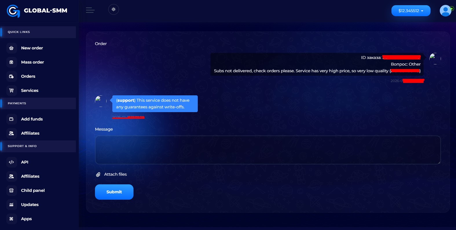 Делал несколько заказов для ВК. Сначала брал дешёвые услуги - пришли боты, все сразу стали собачками, ну думаю ладно, боты же. Заказал дорогих - вообще не пришли, на вопрос почему они не были доставлены и почему услуга высокой цены но низкого качества (т.е. вообще не рабочая по сути) - ответили "Данная услуга не имеет гарантии от списаний". Ну супер. Вы такое отношение к клиентам, мы вам отзывы. Считаю если клиент пожаловался, нужно отменять заказ и убирать услугу, а не тупо брать и кидать. Есть и рабочие услуги, не спорю, но само отношение поражает, видимо для всех ответов в поддержке у них один шаблон "без гарантии".