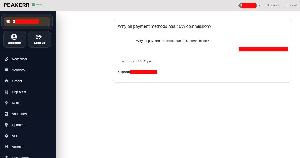 Сотрудничал с панелью peakerr длительное время, прекратил во второй половине прошлого года. Причин несколько. Комиссия 10% на каждом способе пополнения. На вопрос почему - ответили что "цены ниже на 40% чем у других", что звучит как оправдание а не аргумент. Скриншот прикрепил. Рефилл на услугах где он заявлен - практически никогда не отрабатывал. Поддержка отвечала "отправили на пополнение", но по факту результат нулевой. На дорогих услугах где нет информации ни про списания ни про рефилл - стандартный ответ "no guarantee". В итоге приходилось отменять заказы за свой счёт и возвращать деньги клиентам из своего кармана. С крупными заказами тоже начались проблемы, что и стало финальной точкой. Поддержка работает шаблонно - не вникают в суть вопроса, просто отмахиваются. Не рекомендую, есть более клиентоориентированные панели.